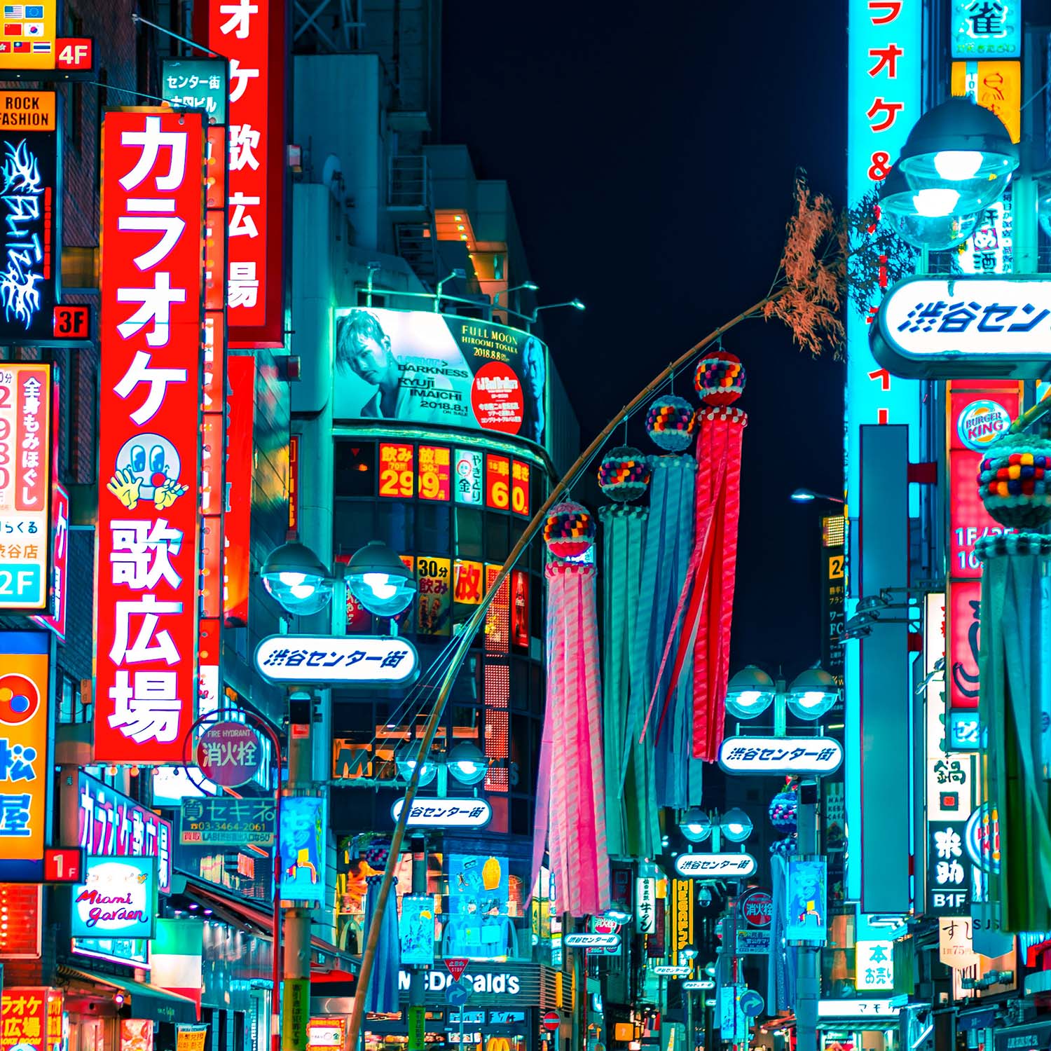 - Barrio de Shibuya. Uno de los barrios de entretenimiento y moda más populares, famoso por sus grandes centros comerciales e innumerables tiendas con carteles luminosos.