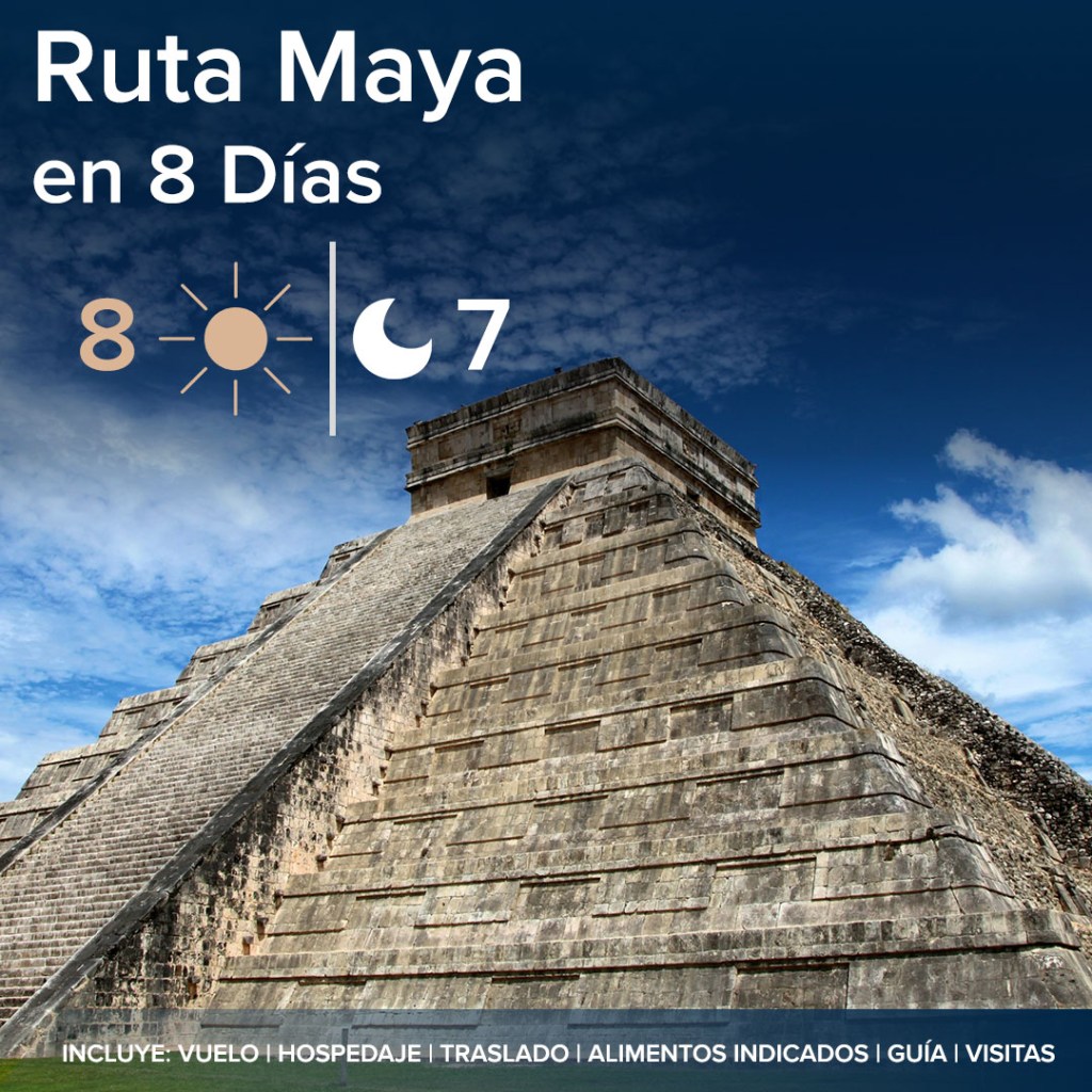 Recorre la Ruta Maya en 8 días, visitando Cancún, Mérida, Campeche y más, con vuelos, hoteles y traslados incluidos. ¡Una inmersión en la historia y cultura de México!