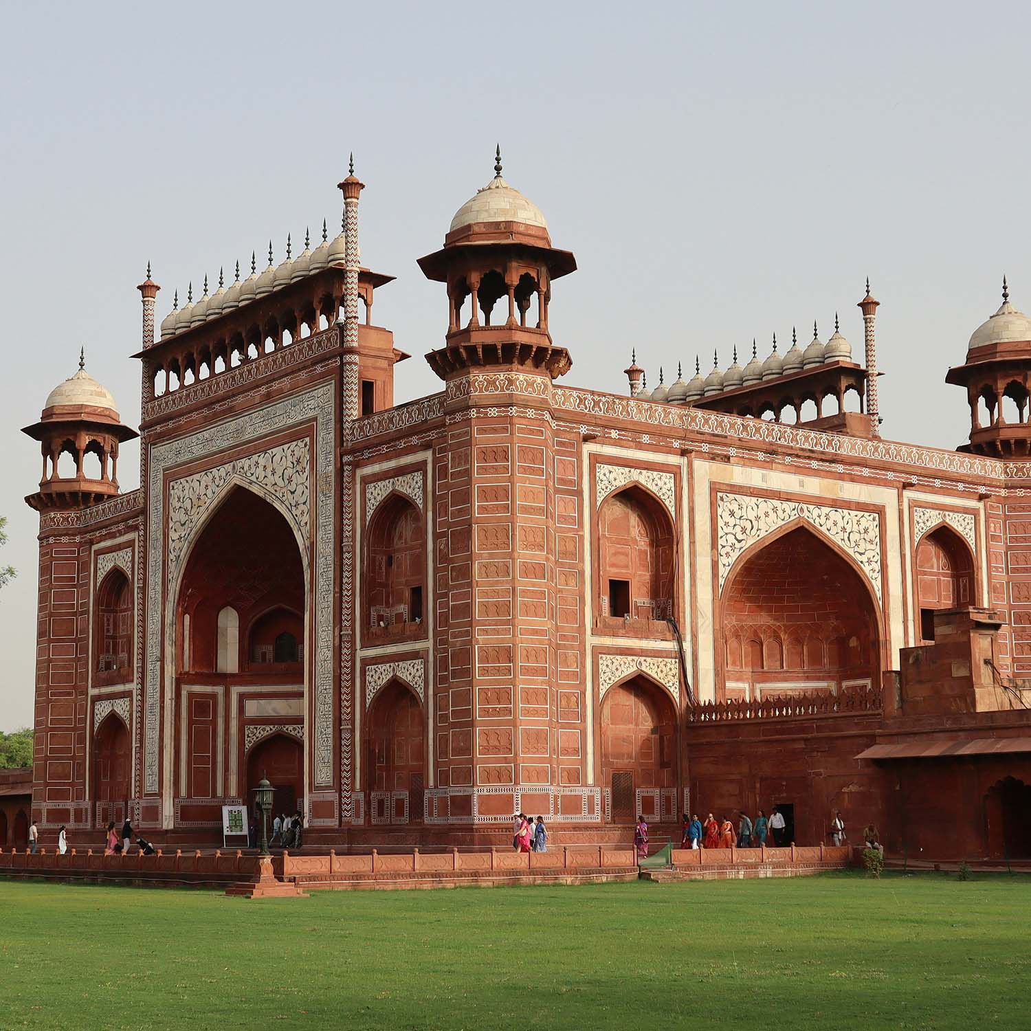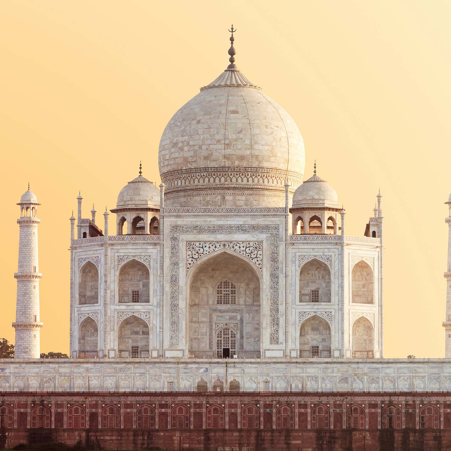 Khan, diseñó este conjunto en un rectángulo de 508 por 304 m. con un jardín central flanqueado en los cuatro lados por pabellones de planta octagonal. El mausoleo, construido totalmente en mármol blanco, consta se levanta sobre un basamento de mármol con un minarete, también blanco, en cada una de las esquinas que alcanzan los 41 m. de altura. El cuerpo central consta de cuatro pequeñas cúpulas que rodean a una más grande situada en medio. En la cripta de este edificio de dos pisos reposan los restos de este matrimonio. Si el conjunto arquitectónico por si mismo ya resulta impresionante la decoración, conocida como piedra dura, en la que los pequeños detalles como los arabescos florales y los motivos geométricos en semi relieve con piedras preciosas entre otros son magníficos convirtiendo esta construcción en una pieza única. Visitas opcionales. Alojamiento.