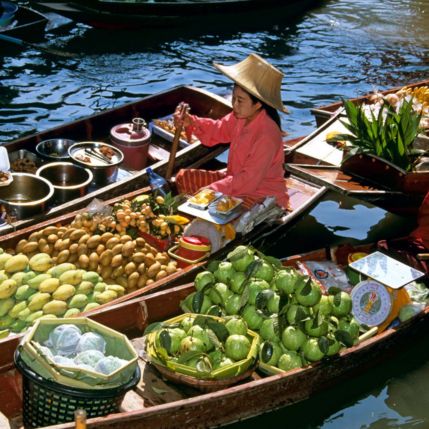 Los mercados flotantes de Tailandia evocan una era anterior,cuando las vías fluviales eran los principales conductos comerciales. Hoy en día combinan productos exóticos (frutas tropicales,comidas aromáticas y las necesidades de la vida de la cuidad) con la oportunidad de conocer a lugareños coloridos en botes tradicionales.